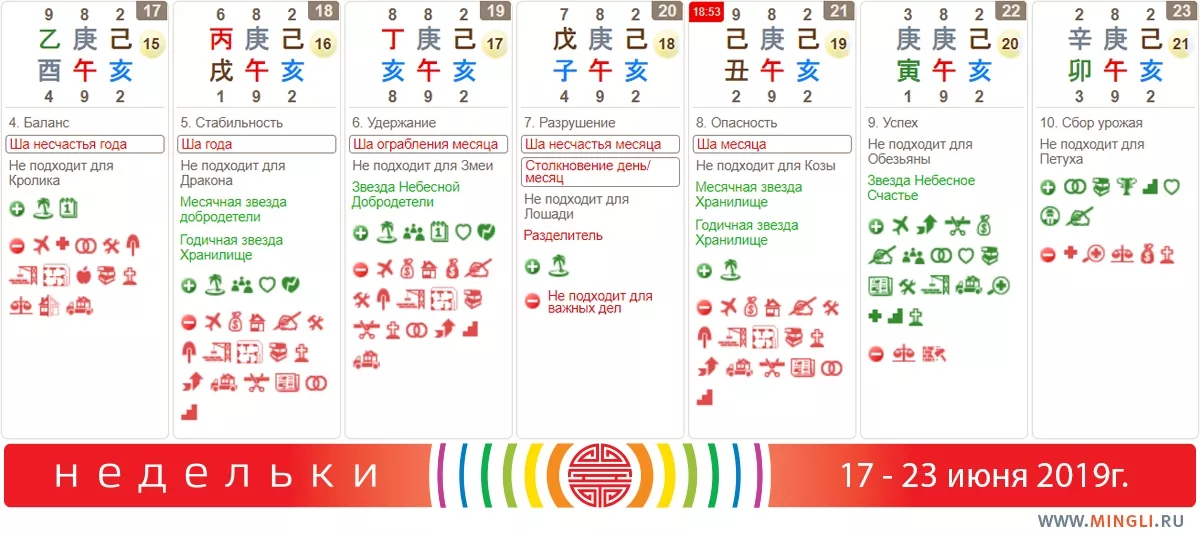23 июня, воскресенье, тоже неплох. Собирайте приятные впечатления, и как можно больше. В час Дракона посидите на юге и подумайте о любой задаче, которую надо решить - этот час дает успехи из ничего. Ну а в час Обезьяны вентилятор на юго-востоке или прогулка в этом направлении поможет найти желанную помощь, попросите Небо о том, что вам нужно. Кстати, в этот час можно переставить кровать. Петухам, к сожалению, эти блага судьбы сегодня недоступны, но ваш черед еще наступит.
