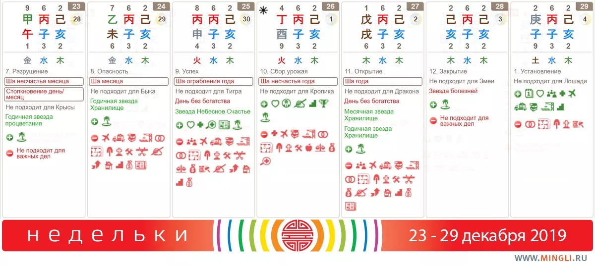 23 декабря, понедельник. Не самое удачное время для новых начинаний. Лучше провести день в повседневных заботах; не стоит заниматься экстремальными видами спорта и за рулем лучше быть осторожным, особенно если в вашей карте бацзы есть Крыса и Лошадь.