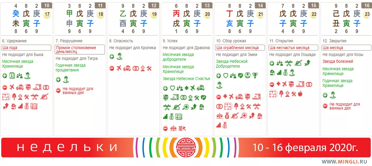 15 февраля, суббота. День особенно благоприятен для людей с элементом личности Земля или Вода (сильная) – они получают благословение нескольких благородных звезд, это означает поддержку от благородных друзей. Действия в такой день могут послужить получению большой прибыли в течение 60-120 дней, денежному успеху в проектах, а также карьерному росту. Сегодня не стоит начинать лечение, делать ремонт или заниматься экстремальными видами спорта.