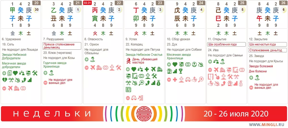 20 июля, понедельник. Хороший день, но слабоватый с точки зрения силы ци. Подходит для большинства позитивных дел, от которых вы не ждете слишком большой отдачи. Не дайте себя запутать - думать много сегодня не рекомендуется ;) В общении ведите себя осмотрительно, особенно с другими поколениями.