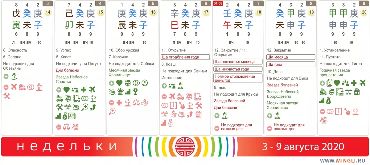 9 августа, воскресенье. День хорош для размышления, особенно об отношениях с конкурентами или родственниками. Посвятите часик-другой раздумьям о том, как вы будете выстраивать взаимодействия с ними. Внимание: всем, у кого в карте бацзы есть Янское Дерево на Обезьяне, Янское Дерево на Тигре или же столп Ву Инь (Земля на Тигре) лучше не планировать дальних поездок или важных дел.