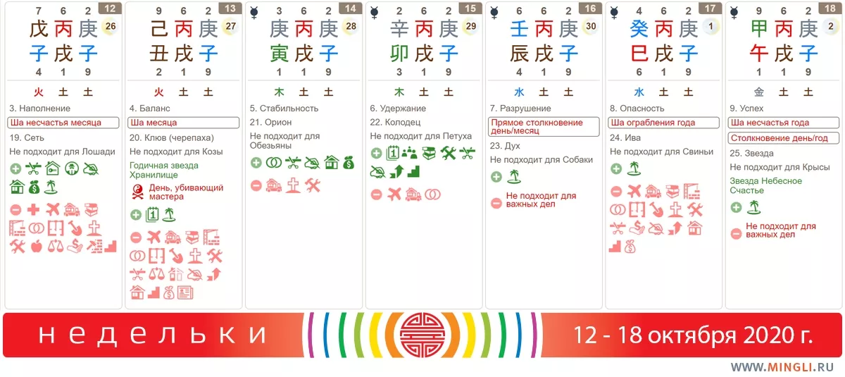 12 октября, понедельник. День неплохой, особенно для слабой янской Земли. Лучше всего делать что-то, что вы намерены повторить: начинать новое, открывать бизнес, получать деньги) Не стоит начинать лечение или спорить с бывшим о разделе имущества. Если вам благоприятна вода - не выбирайте понедельник для чего-то важного. В час Змеи можно помедитировать на успех в делах на юге (в крайнем случае - спиной к югу. Не подойдет, к сожалению тем, кто рожден в день или год Лошади.