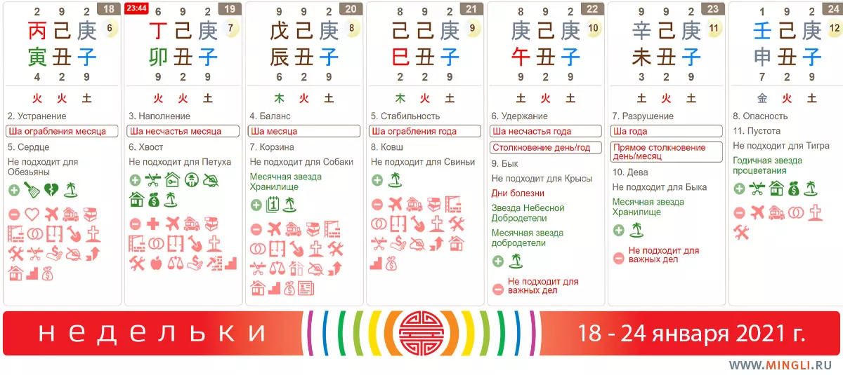 18 января, понедельник. Хороший день, в основном, из-за благоприятных звезд. Основное “табу” ша ограбления - это подписание документов, особенно финансовых и начало поездки. Надо быть готовым к тому, что любая оплата может оказаться чуточку больше, чем вы планировали. Земляные и ремонтные работы не производятся в любой из дней ша (то есть, 19-23 января также). Не смотря на день Устранения, сегодня можно начинать проекты.