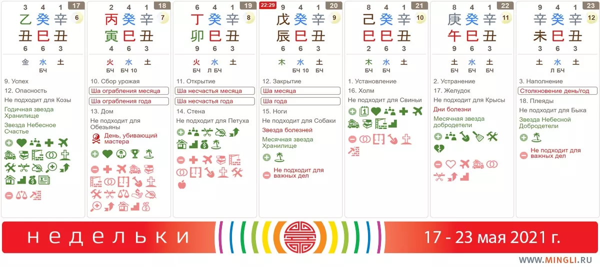 18 мая, вторник. Сегодня - ша ограбления, да еще и Сбор урожая. Поэтому у вас есть все шансы попросить и получить свои деньги обратно. Не рекомендуется это делать только Огням с сильной картой. В целом же, для позитивных финансовых мероприятий (договоренностей, подписания контрактов, серьезных покупок) день не подходит. Также не стоит начинать большую поездку. Фэншуисты сегодня отдыхают: измерения запрещены.