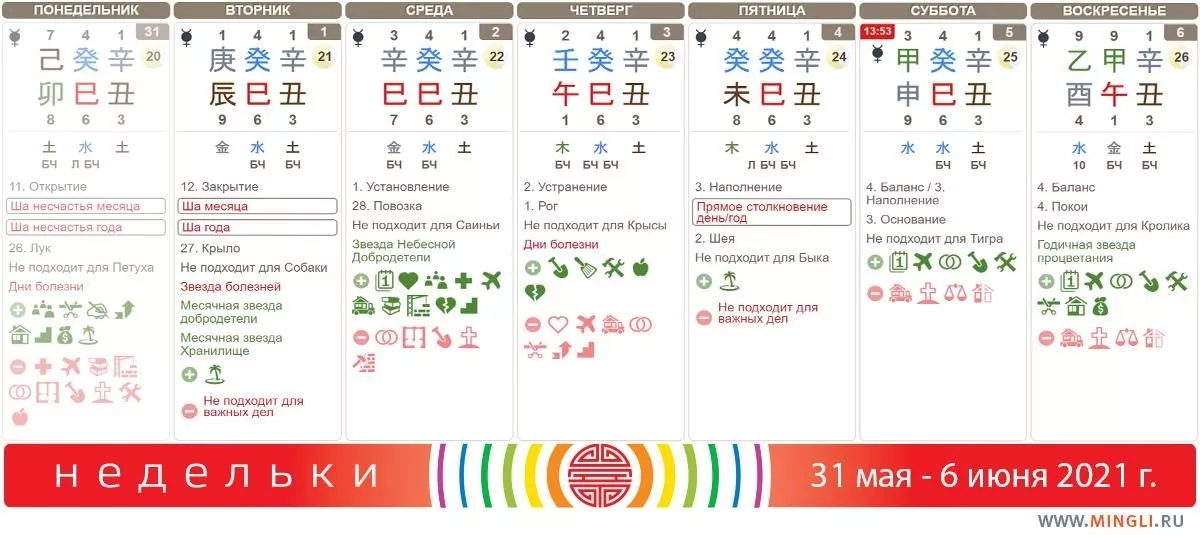 4 июня, пятница. Отдыхаем! Особенно стоит поберечь здоровье тем, кто рожден в дни Дерева или иньской Воды. Для серьезных действий день не подходит, не стоит затевать ремонт, перестановки или земляные работы.