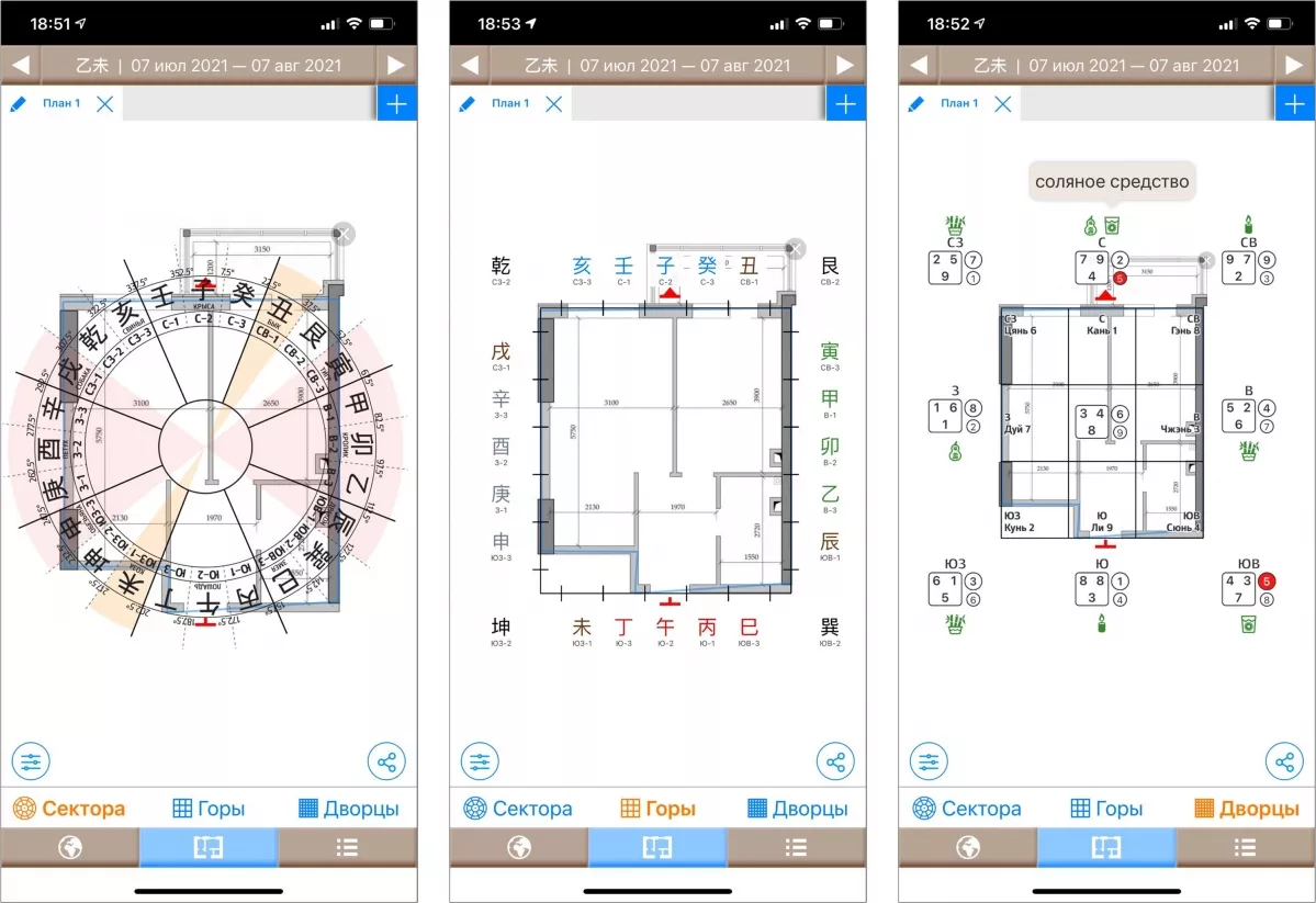 Теперь в программе есть три удобные закладочки – вы можете посмотреть направления (сектора), построить горы 7х7 (ура!) и дворцы.