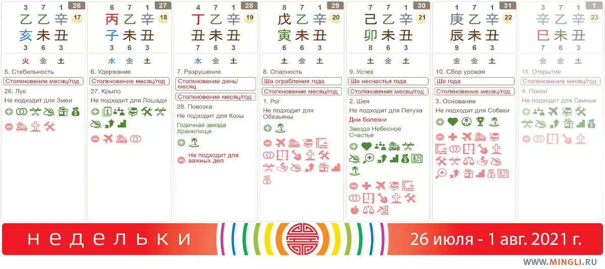 28 июля, среда. Ставим важные дела на паузу, особенно, если в карте бацзы есть Быки-Козы и земля не полезна. Если все-таки надо что-то предпринять, выбирайте хороший час, например, Змеи или Петуха (Петух подходит не для всех дел, смотрите описание часа). Точно не стоит начинать ремонт в доме!
