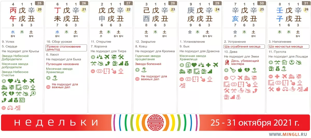 25 октября, понедельник. Ну что ж, начинаем с хорошего денька, так что подготовьтесь заранее. Крысы - чужие на этом празднике жизни, потому что к ним пришел личный разрушитель, зато всем остальным, особенно тем, кому благоприятен Огонь, которого так не хватает осенью, день может пригодиться! Да, сильным иньским Огням также не стоит рассчитывать на многое - Грабитель Богатства во всей красе проявится в этот день. Посмотрите на список - можно планировать практически любые позитивные дела: он подходит для свадьбы, строительства, переезда в новый дом, путешествий, торговли, начинания бизнеса и проектов, земляных работ. Действия приносят богатство, хорошую репутацию, много детей, помощников. Только в суд подавать и разрушать старые постройки не стоит, как сообщает нам классика.