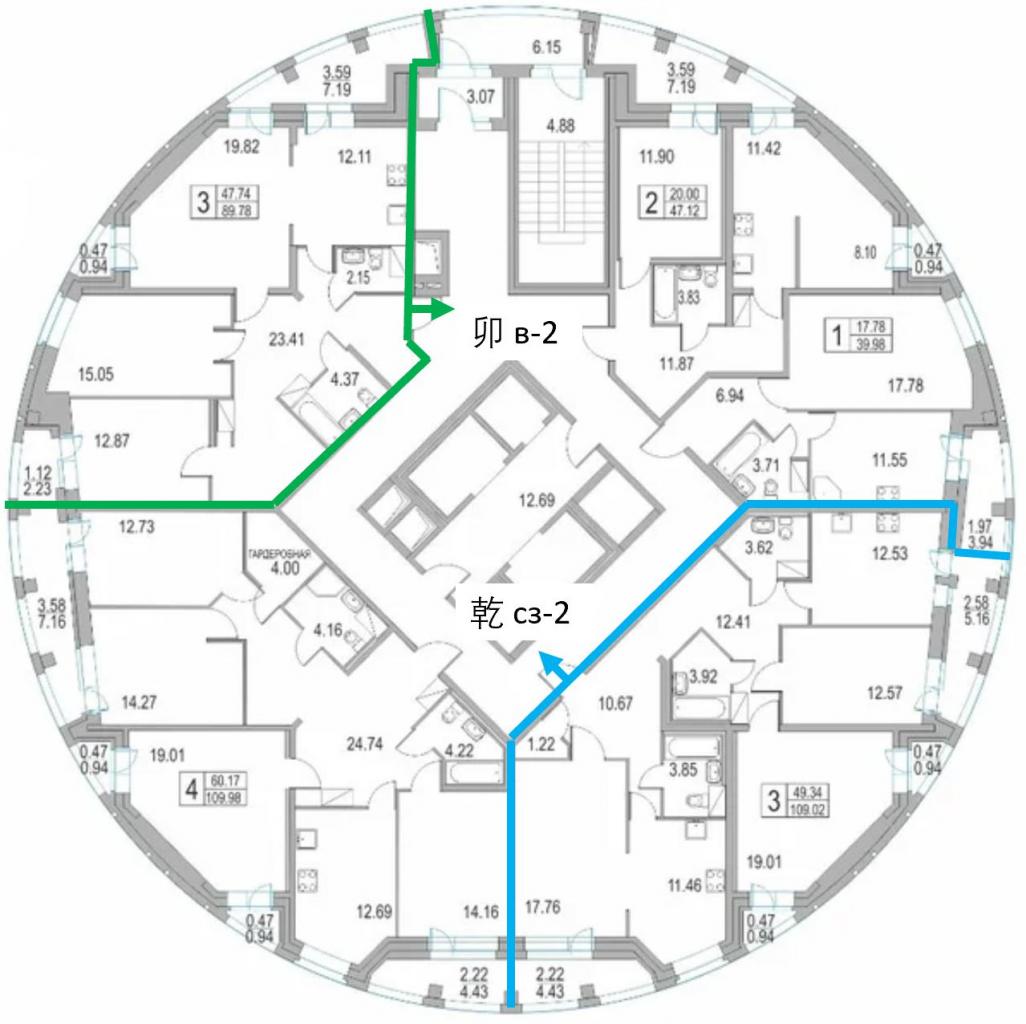«Синюю квартиру» мы точно не рекомендуем клиенту. «Зеленую» – еще поисследуем. Если клиент настроен на поиск чего-то лучшего, а также если, помимо активной 52, мы увидим еще что-то критически неблагоприятное с точки зрения фэн шуй – то снова примемся за поиски.