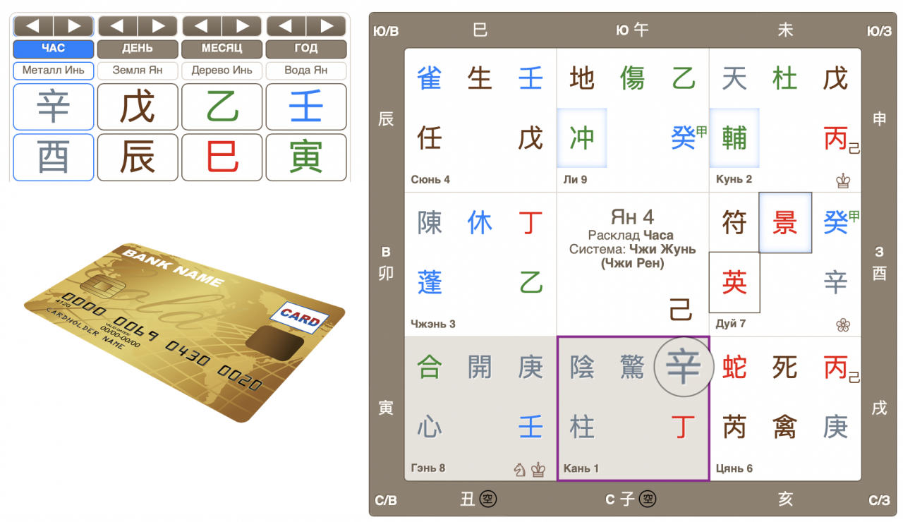 Помня правила чтения расклада о потерянных вещах, обнаружила, что Банковская карта – Небесный ствол часа 辛Синь во дворце Кань, а там Пустота (серый квадрат в раскладе).