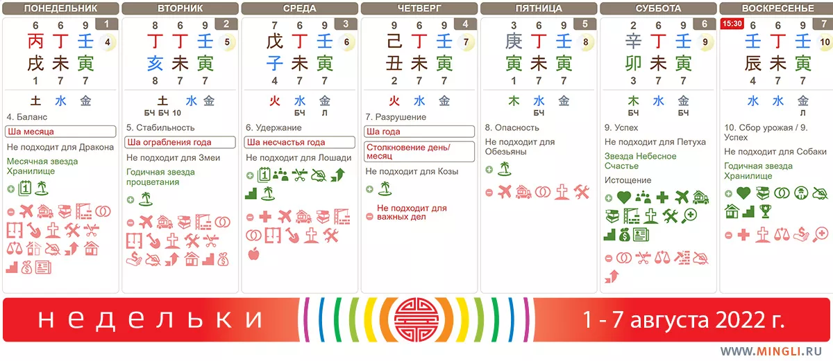 Последняя семидневка месяца Козы. В воскресенье начнется месяц Обезьяны и сезон осени (Металла). В этом году месяц Обезьяны непростой, хорошо бы подготовиться к нему, поэтому обязательно читайте в Блоге наш прогноз на август. Перестановки по Фэн Шуй лучше сделать заранее, до 7 августа, как и начать ремонт, так как затем целый месяц серьезные ремонтные работы лучше не планировать.