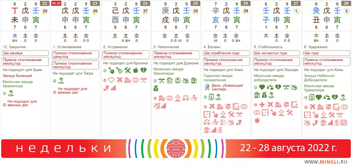 23 августа, вторник. Дубликат месяца и столкновение. Поэтому всем, кому не полезны Металл и Земля, а также, если у вас в карте бацзы есть Тигр или Обезьяна (особенно земляная) сегодняшний день стоит провести день тихо-мирно, не принимая важных решений. Будьте осторожны на дороге и во время занятий спортом. Янским Землям и Металлам нужно беречь здоровье. Для важных дел и переговоров день не подходит.