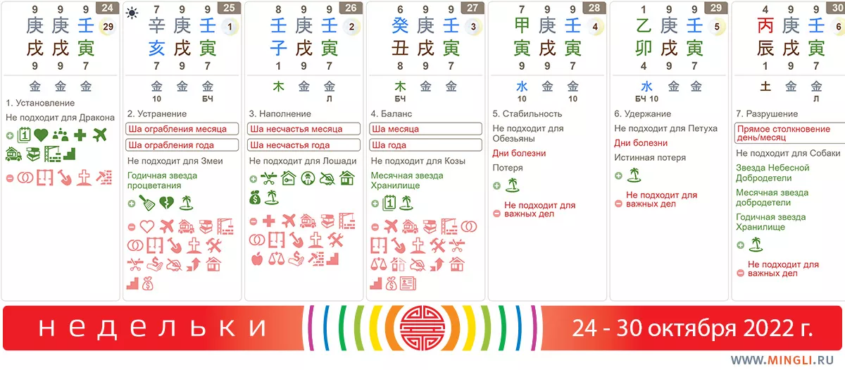 29 октября, суббота. Также день «потери времени», то есть ничего важного лучше не начинать. Откуда берутся такие дни? Все дело в том, что Дерево в сезон Металла очень слабо, поэтому полностью «деревянные» дни не дают осенью того количества благоприятной ци, которого хватило бы для реально крутого запуска проекта. А так в этих днях нет ничего страшного. Так что сегодня лучше всего заняться домом, бытом, отдыхом, встречами с друзьями.