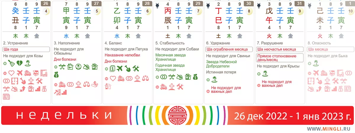 28 декабря, среда. Что точно не стоит делать – так это назначать свидания или какие-то разборки с друзьями – высока вероятность поссориться или даже расстаться. В остальном, особенно если Дерево для вас благоприятно, можно заниматься большинством позитивных дел. Важно, что энергии дня не дают выигрыша; они только позволят подтянуться до более сильного конкурента. И сегодня также не рекомендуется посещать места большого скопления людей и чихающих коллег и приятелей.