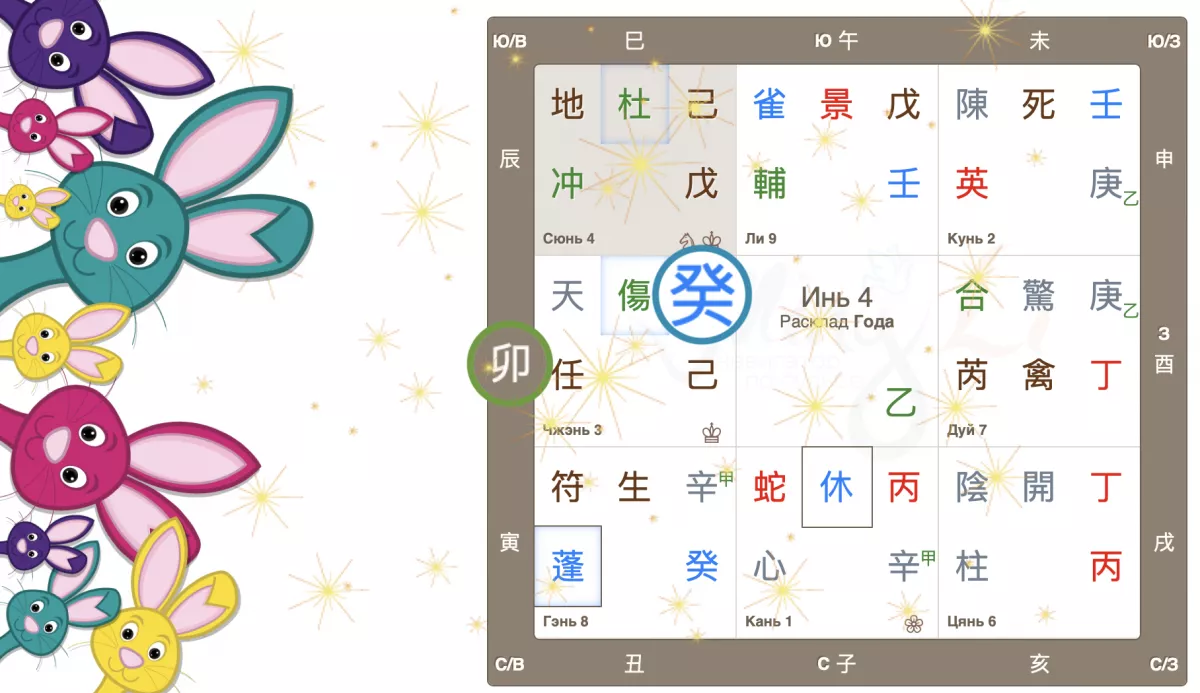 Как видим, Небесный ствол года 癸 Гуй (иньская вода) опустился в дом Чжэнь с Земной ветвью 卯 Мао (Кролик). Вот так сюрприз! Ствол и ветвь приходящего года в одном дворце, так случается далеко не всегда. Можем предположить, что влияние энергий года четко выражено, удвоено.