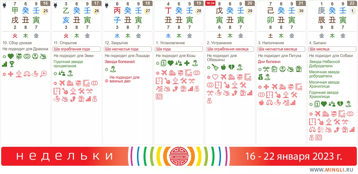 19 января, четверг. Подойдет для планирования, встреч, общения, но окончательные решения лучше не принимать. Также сегодня не рекомендуется делать что-то, что требует точных сроков: добиться пунктуальности будет сложновато. Не создавайте сегодня шума в центре дома, поскольку это ударит по матери семейства. Тем, кто родился в день иньского Огня или Земли (любой полярности) рекомендуется поддержать здоровье.