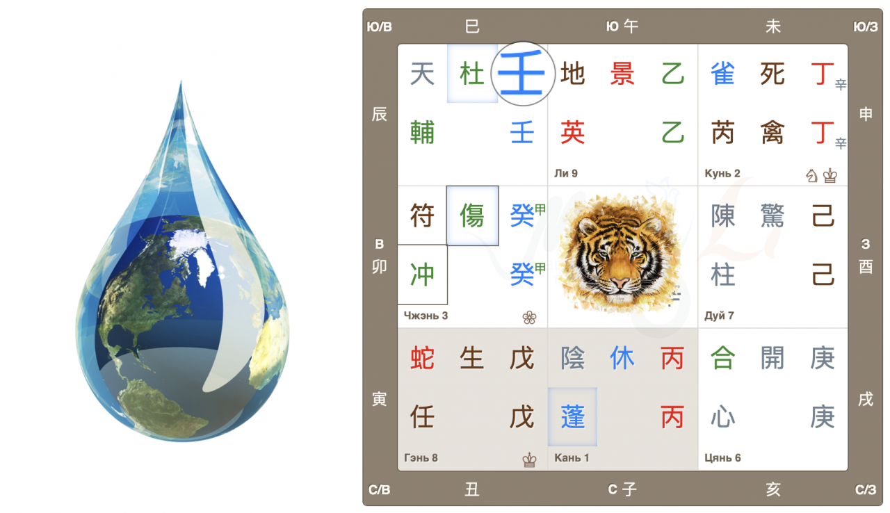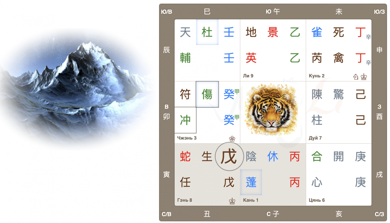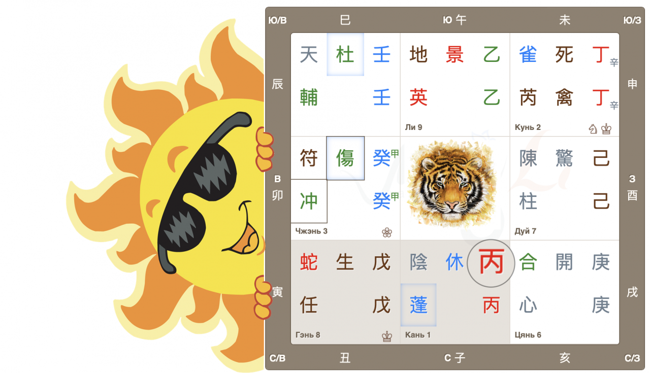 Во дворце Чжэнь собрались 3 важных знака: Главный дух 符 Джи Фу, Главные врата 傷 Ранение и, Небесный ствол года 癸, Тай Суй. Высока вероятность принятия судьбоносных решений, в том числе во властных структурах.