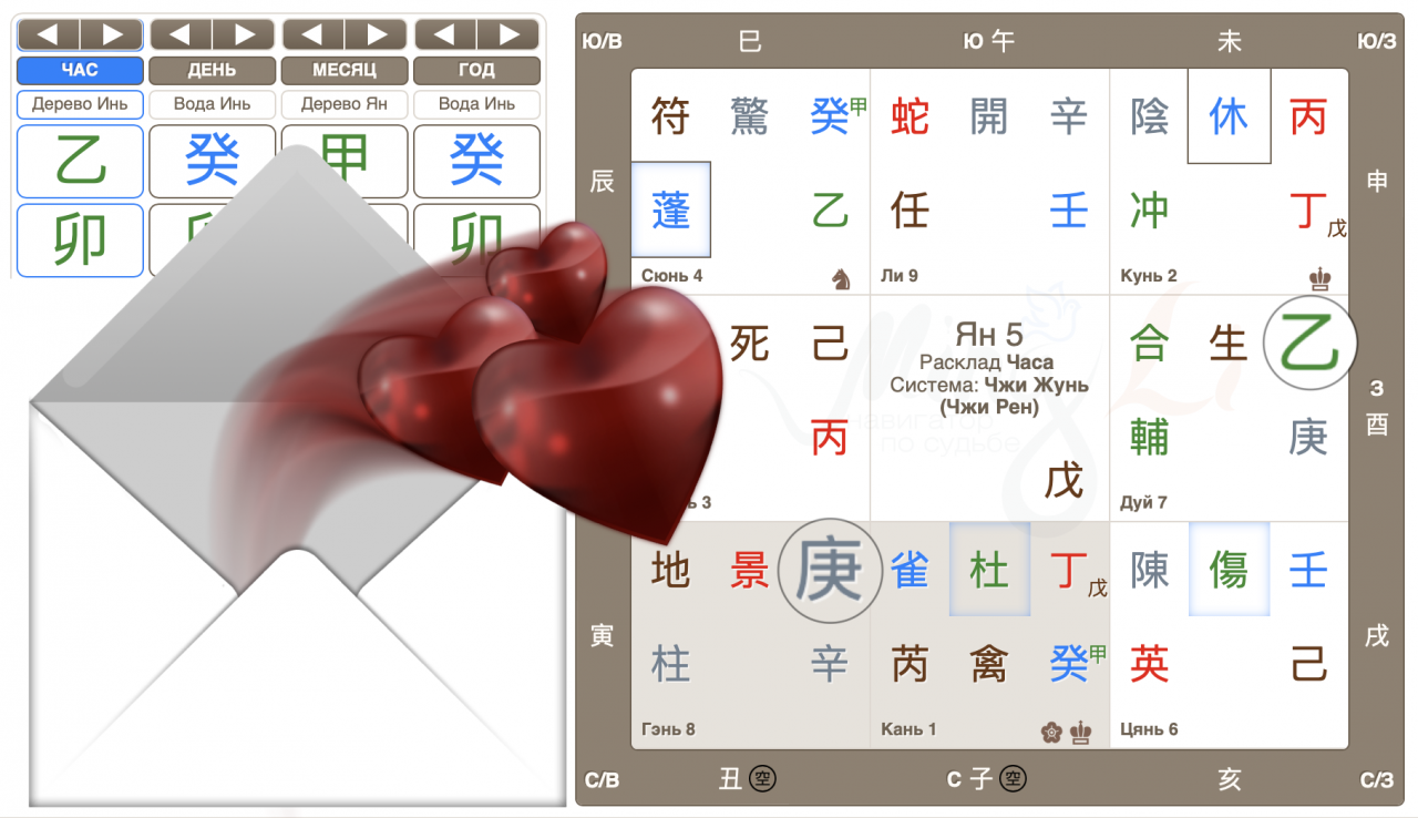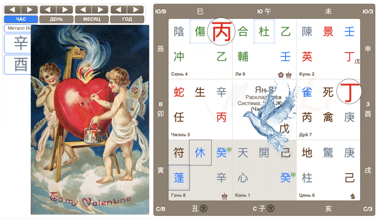 Когда же в этот день встреча ищущих сердец наиболее вероятна? Для этого пробуем найти час, в котором наши фигуранты очень заметны. Та-дамс! Есть в дне такой час! Расклад часа Петуха, в котором симпатичный丙 и трепетная 丁 опустились в те же дома, что и в раскладе дня, а значит выделяются, подпитываются фоном дня. Час Петуха активно способствует пересечению «случайных взглядов».