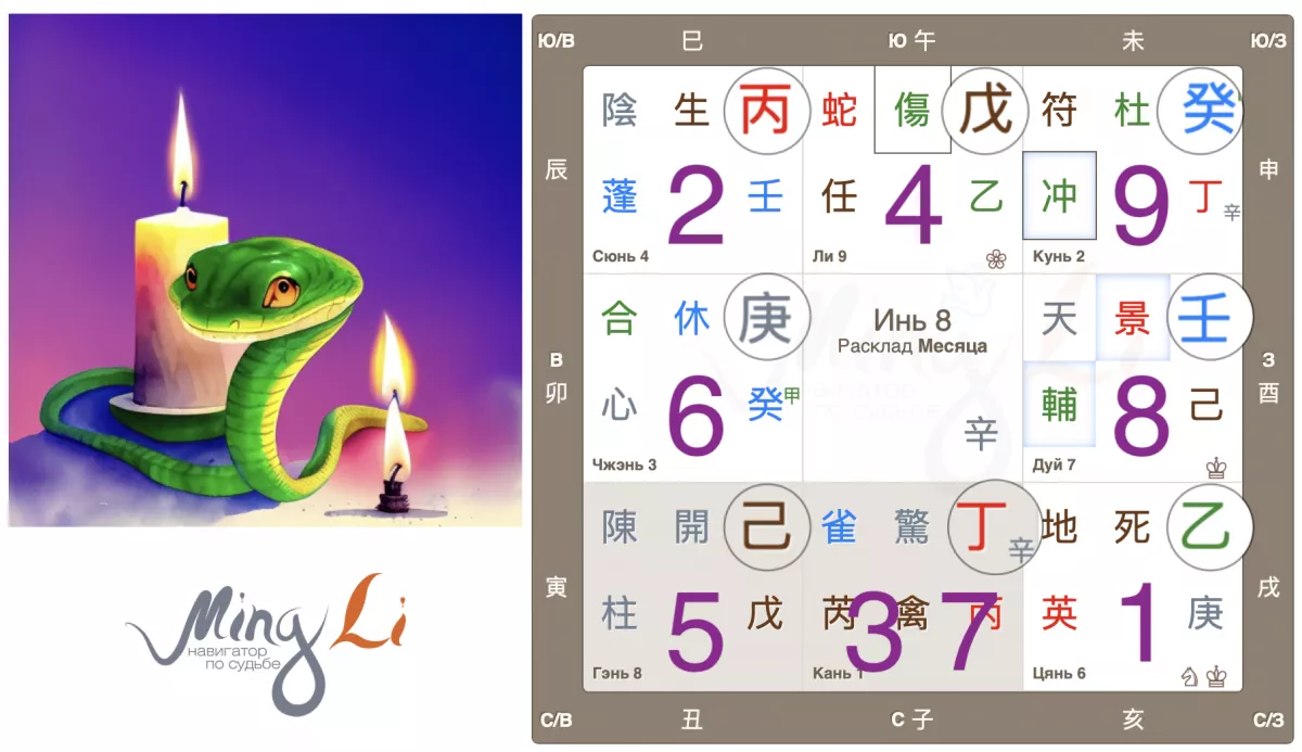 В раскладе Небесный ствол месяца Огонь Дин 丁 опустился в дом воды Кань, а вода гасит огонь. Сама по себе вода переменчива, порой неожиданна и может испугать, в то же время вода всегда стремится вниз, к покою. Разные денечки нас ждут в мае, тренировки на стрессоустойчивость в реальном времени. Можно реализовать такие «качели» через осознанный уход в «обрыв»: пара деньков вдали от всех и вся, а дальше можно снова в житейский океан забот. Земная ветвь месяца 巳 расположена в юго-восточном дворце Сюнь, который характеризуется движением Дерева. Все растет вширь, проникает, дует ветер перемен. Хорошее время для новых идей, роста и развития. Через стресс к развитию, через тернии к звездам. Звучит неплохо, как думаете, друзья?