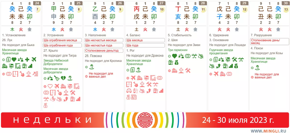 24 июля, понедельник. Прекрасный день для начала недели. Помедитируйте на тему планов, подумайте, какие ресурсы вам нужны для их реализации, договоритесь о важных встречах или проведите первичные переговоры. Серьезных решений пока не принимайте, время для этого не пришло. Иньской Воде и Деревьям, особенно слабым, стоит поберечь здоровье.