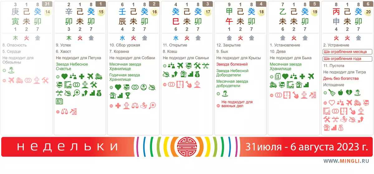 1 августа, вторник. День поддержан многими благородными звездами. Благоприятен для ремонта, переезда в новый дом, начала бизнеса и проектов, путешествий и свадьбы. Приводит к росту имущества, неожиданному богатству, рождению прекрасного сына. Иньским Металлам может повезти особенно, а вот янским надо беречь свои финансы и достижения, чтобы их не присвоили другие. Петухам стоит воздержаться от активных действий сегодня.