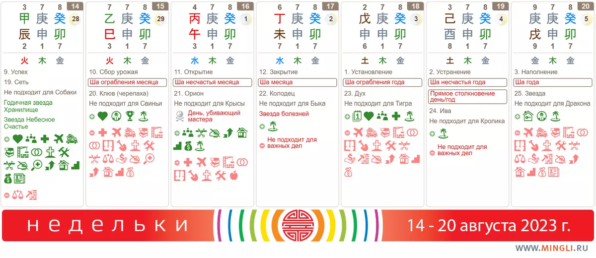 19 августа, суббота. Столкновение дня и года обычно говорит о том, что возрастает травмоопасность, вероятность конфликтов и неправильного принятия решений. Петух становится сильнее осенью, поэтому столкновение может быть более жестким, особенно в час Собаки. Учитывая что день этот – ша несчастья, точно не стоит рисковать за рулем или во время занятий спортом, особенно при наличии в карте Бацзы Кролика или Кролика-Петуха и полезности Дерева. Важное на этот день лучше не планировать. Начинать лечение точно не стоит!