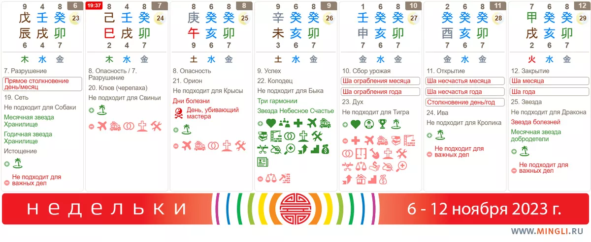 6 ноября, понедельник. Пока что еще у нас сражаются Собака и Дракон, поэтому если эти две земные ветви есть у вас в карте – проведите день на минималках, не вступая в конфликты и помня о травмобезопасности. Кроме того, это день перед сменой сезона, поэтому все равно дела б не задались. Так что бытовые дела, обычные активности – это то, что лучше планировать на сегодня.