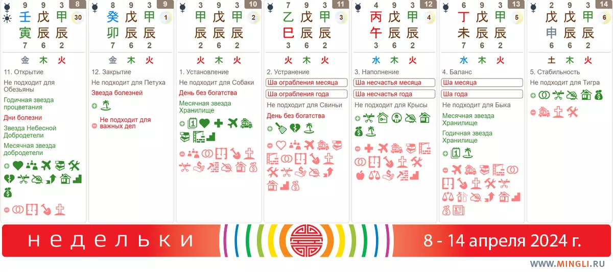 11 апреля, четверг. Сегодня влияние ци «без богатства» продолжается. Парочка Ша Ограбления и цзян чу Устранение довершают картину: точно не нужно подписывать документы, запускать бизнес и начинать проекты – обдерут, как липку. В дне также присутствуют звезды жестокости, поэтому для важных начинаний он не рекомендован.