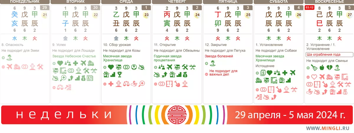 29 апреля, понедельник. Заканчивается 60-дневный цикл, и в последний день этого цикла ци не особенно много. Жаль, что такой день пришелся на понедельник! Но ничего, вторник, среда и четверг дадут нам возможности, а сегодня посвятите завершению дел, подготовке к новым проектам и обычным занятиям.