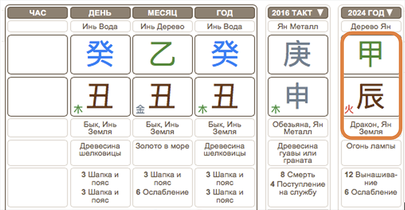 Год 2024 – год Деревянного Дракона. Наинь – Огонь 火, находится в цикле порождения с наинь года рождения нашего героя – Дерево 木. О чем это говорит? Год достаточно спокойный с точки зрения карьеры и лучше использовать его для укрепления семьи, для личных отношений. В Китае считалось, что цикл порождения элементов по наинь больше подходит для личных и семейных вопросов, а цикл контроля и преодоления – для бизнеса, карьеры.