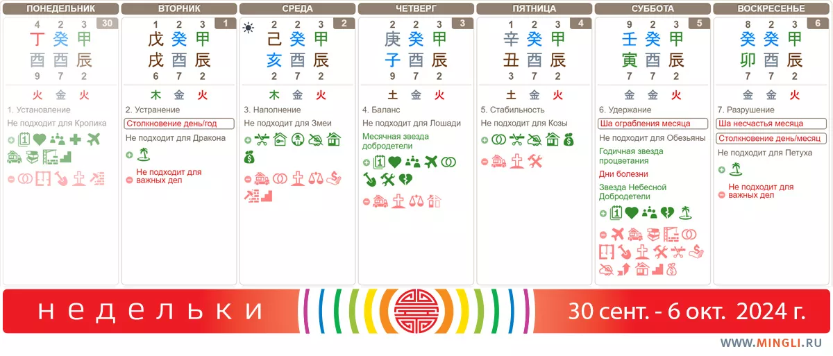30 сентября, понедельник. Не годится для новых начинаний. Это день «чистый», лучше посвятить его общению, переговорам, планированию, поиску информации, обычным активностям. Не годится для свадьбы или начала проектов. Сильным иньским Огням может повезти, а вот янским Огням лучше заняться благотворительностью.