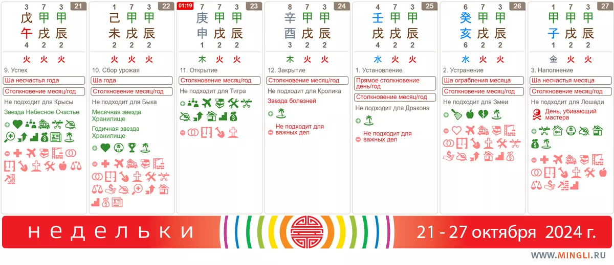 27 октября, воскресенье. День 甲子 подходит для большинства дел, начало нового 60-ти дневного цикла. На удивление неплохой, лучше наполнить его приятными делами и новыми начинаниями. Запланируйте программу изменений на 2 месяца – если начнете сегодня, то как раз закончите к 25 декабря – идеально 🙂. Пожалуй, единственное табу – медицинские процедуры. Ну и спортом занимайтесь аккуратно, Лошадям по году или дню это особенно актуально.
