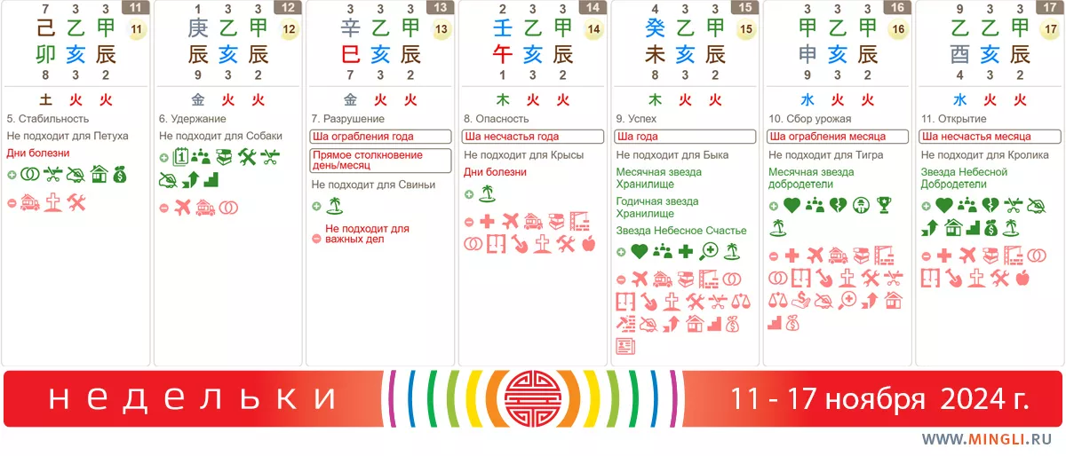 15 ноября, пятница. Чрезвычайно благоприятный день, поддерживаемый благородными звездами. Он очень хорош для строительства,свадьбы, путешествия. На пути будут встречаться благородные помощники, в доме будет мир и поддержка в течение 100 дней. Также дела, сделанные в этот день, приводят к увеличению собственности, рождению прекрасного сына и хорошей удаче семьи. Ша немножко портит ситуацию, но влияет, в основном на сроки – они могут «подгорать» или быть сорваны.
