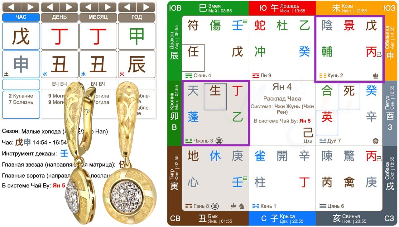 Вопрошающая НС дня 丁 опустилась во дворец Чжэнь, а потерянная вещь НС часа 戊 – во дворец Кунь. Уже по наполнению дворца Кунь было понятно: серёжка дорогая, красивая и хорошего качества. Это показывали и ворота 景 Сцены, и структура 戊丙, сам 戊 и звезда 輔 Тянь Фу – всё указывало на ценность предмета.