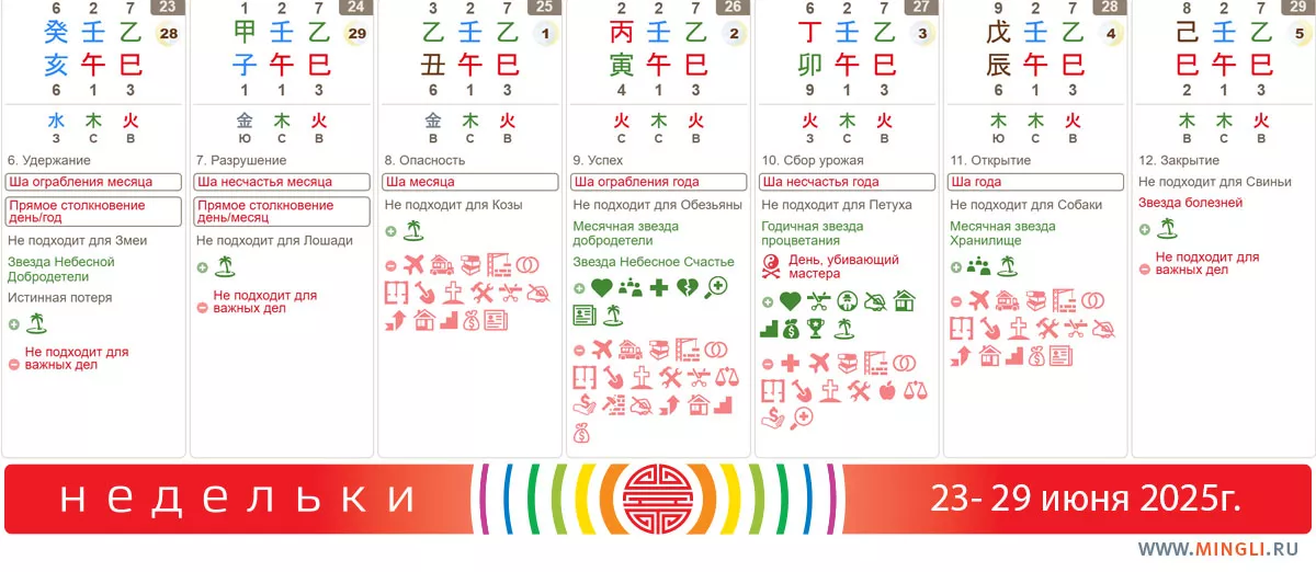 Планируйте недельку грамотно, чтобы потом не рассказывать друзьям, что, видимо, встали не с той ноги 😌! А еще лучше – начните изучать Бацзы, и будете сами знать, какие дни для чего хороши (причем, с учетом своего дня рождения) и как проложить путь к успеху 💯! Сегодня, 20.06.2025, – последний день раннего бронирования и возможность попасть в осеннюю группу!