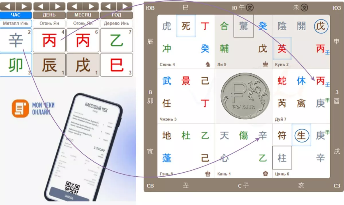 Взгляд сразу зацепился за такой момент: в каждом важном доме - у Вопрошающего НС дня и у Небесного ствола часа (дело) - звезда и врата разных стихий по У Син. Врата Отдыха (Вода) и Звезда Тянь Жуй (Земля) в доме Дуй, Врата Ранения (Дерево) и звезда Тянь Синь (Металл) в доме Кань. Контроль, перекос, словно что-то не сходится. Отметила это себе на полях!
