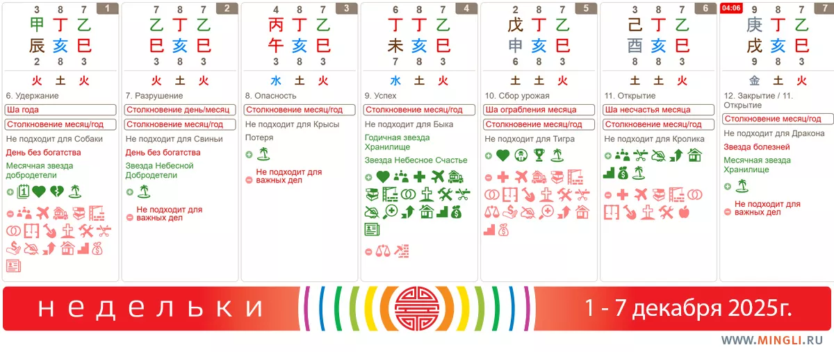 Спойлер: самый симпатичный день на неделе - четверг, самый “бесполезный” - вторник. Начинать ремонт лучше в среду или четверг, но логичнее всего дотерпеть до следующей недели, когда начнется новый месяц и столкновение закончится. Смена сезона произойдет 7 декабря - на смену Огненной Свинье придет Земляная Крыса.