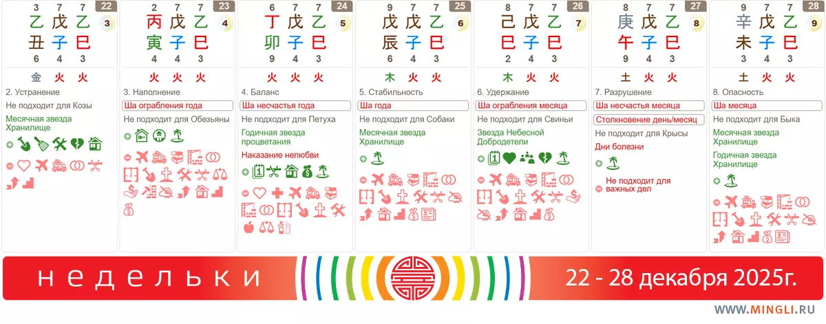 22 декабря, понедельник. Отличный день, не смотря на индикатор. Наш секретный секрет, который вы узнаете только из Неделек: вообще, Устранение обычно не подходит для позитивных дел, но конкретно этот день в декабре - подходит! Он благоприятен для свадьбы, строительства, путешествий, начала бизнеса и проектов, земляных работ. Поддержка благородных звезд сглаживает сделки в бизнесе. Ни в чем себе не отказывать могут все, кроме Коз и янских Деревьев. Инским Деревьям, особенно слабым стоит именно сегодня начинать важные проекты.