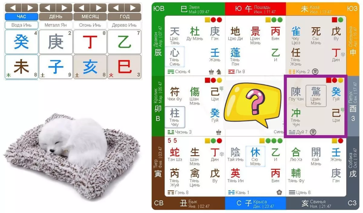 Дом Дуй, где наша потеряшка, рисовал картину потери ясности, торможения и суеты. Пустота по часу сразу настраивала на пессимистичный лад. Врата Шок 驚 указывали на шумное, праздничное место, возможно, зону развлечений, в которой царила предновогодняя суета, вот она-то и смогла поглотить маленькую собачку. Звезда Тянь Чун 冲, говорила о поспешности и нестабильности. А дух Гоу Чэн тоже не сулил ничего хорошего.