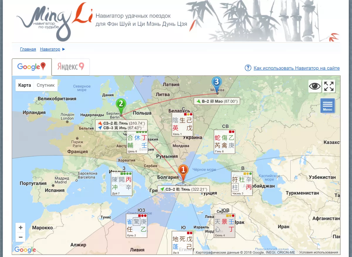 - Азимуты на сфере: учитывают сферическую форму земной поверхности при определении направления. Китайские мастера определяли и определяют направление по картам, не учитывая кривизну Земли. Вы можете поступать также, отключив азимуты на сфере. Кстати, используя кнопку «Радиус», вы можете менять протяженность секторов направлений на плоской карте. Однако, времена меняются и человек сегодня способен преодолеть огромные расстояния всего лишь за сутки-двое. В такой ситуации, особенно при движении ближе к полюсам, разумнее учитывать сферическую форму Земли, так как карта передает очертания и расположение материков с достаточно большими искажениями. Поэтому мы рекомендуем смотреть направления для поездок с учетом азимутов на сфере.