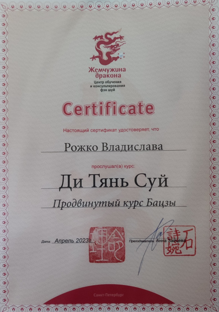 с 2014 года изучаю Бацзы, 2016 Фен Шуй, 2019 Ци Мень Дунь Цзя, 2024 диагностика в ТКМ.