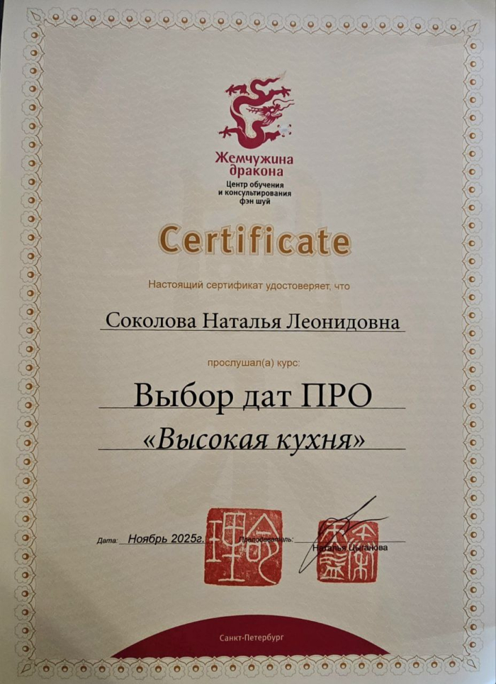 Я – сертифицированный консультант по бацзы от центра обучения и консультирования «Жемчужина Дракона». Также я являюсь сертифицированным инструктором по «Практикам Вселенского Дао».