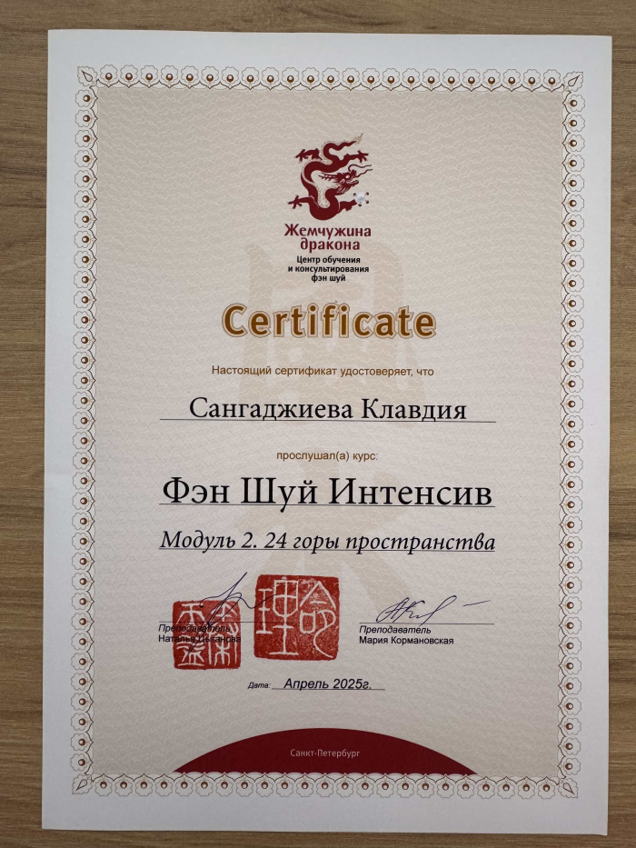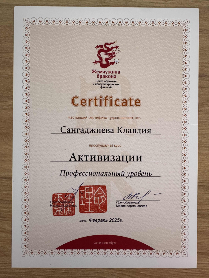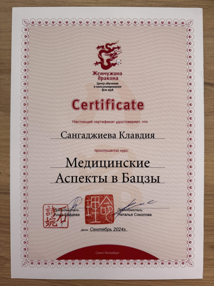 Меня зовут Клавдия, я сертифицированный консультант по Бацзы от центра обучения и консультирования "Жемчужина Дракона". С января 2023 года прошла все обучающие курсы по Бацзы на Минли. С осени 2023 года успешно провожу консультации. От всей души благодарю за полученные знания преподавателей, Анну Зайцеву и Наталью Цыганову. На данный момент продолжаю обучение на курсе по фэн шуй на Минли.